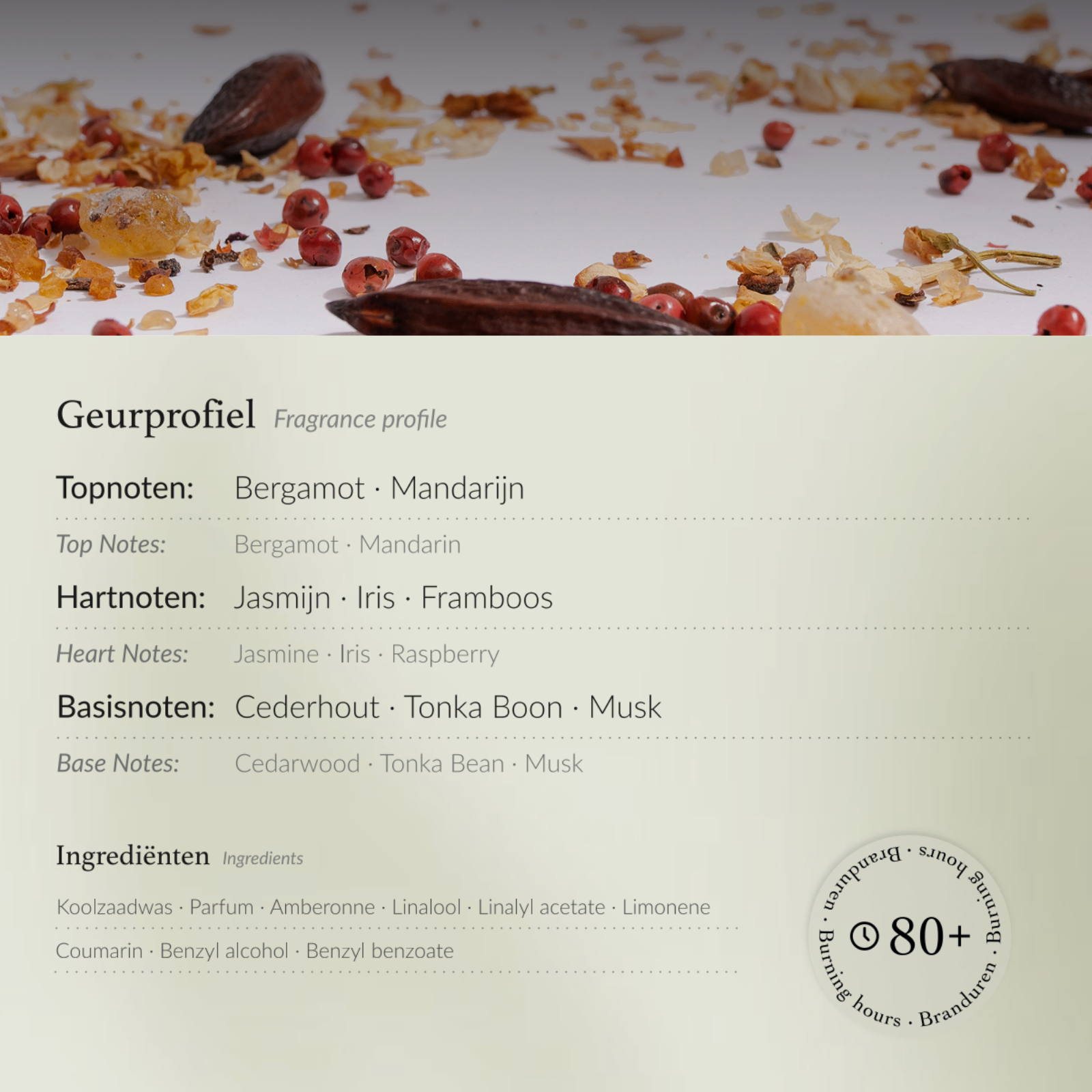 Onze parfums zijn zorgvuldig samengesteld met hoogwaardige parfumoliën, zonder onnodige toevoegingen. Daardoor verspreidt de geur zich natuurlijk in je interieur – zacht aanwezig, nooit overheersend. Zelfs zonder het vlammetje wordt je ruimte gevuld met een verfijnde geur, alsof je huis altijd een warme uitnodiging is.