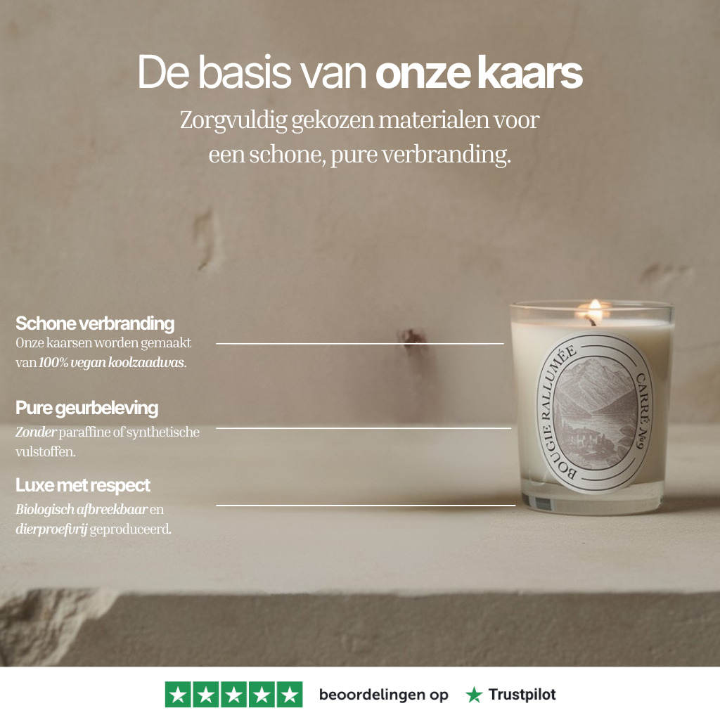 Onze kaarsen branden gemiddeld 40–55 uur, afhankelijk van de ruimte en luchtcirculatie. Elke kaars wordt gegoten met een plantaardige, langbrandende waxmix die zorgt voor een stabiele, schone verbranding.