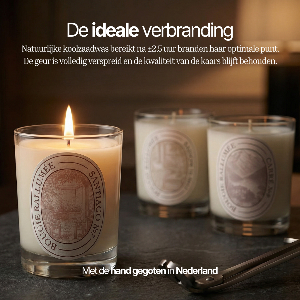 Het neurologische effect ontstaat niet direct bij het aansteken, maar na een korte opbouw. Laat de kaars branden tot de bovenkant volledig is gesmolten tot een waxpool. Vanaf dat moment heeft de geur zich voldoende verspreid om de juiste signalen te activeren. Meestal ervaren mensen dit binnen 20–40 minuten, afhankelijk van ruimte en gevoeligheid. Voor het beste resultaat brand je Santiago maximaal 2,5 uur achter elkaar.