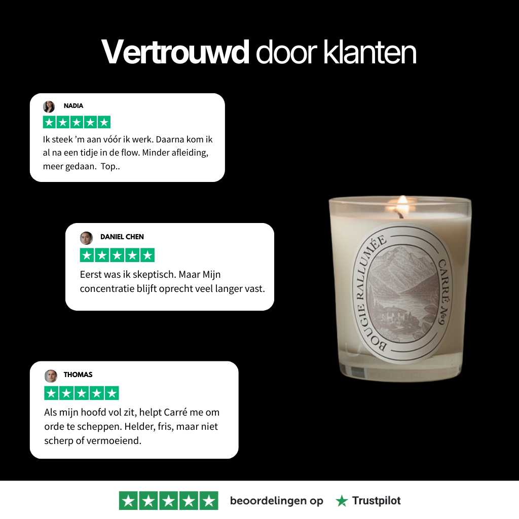 Ik had constant het gevoel dat mijn gedachten alle kanten opgingen. Met Carré ontstaat er rust en focus tegelijk. Geen zware geur, maar iets dat me helpt helder te blijven. Ideaal tijdens werken of lezen.