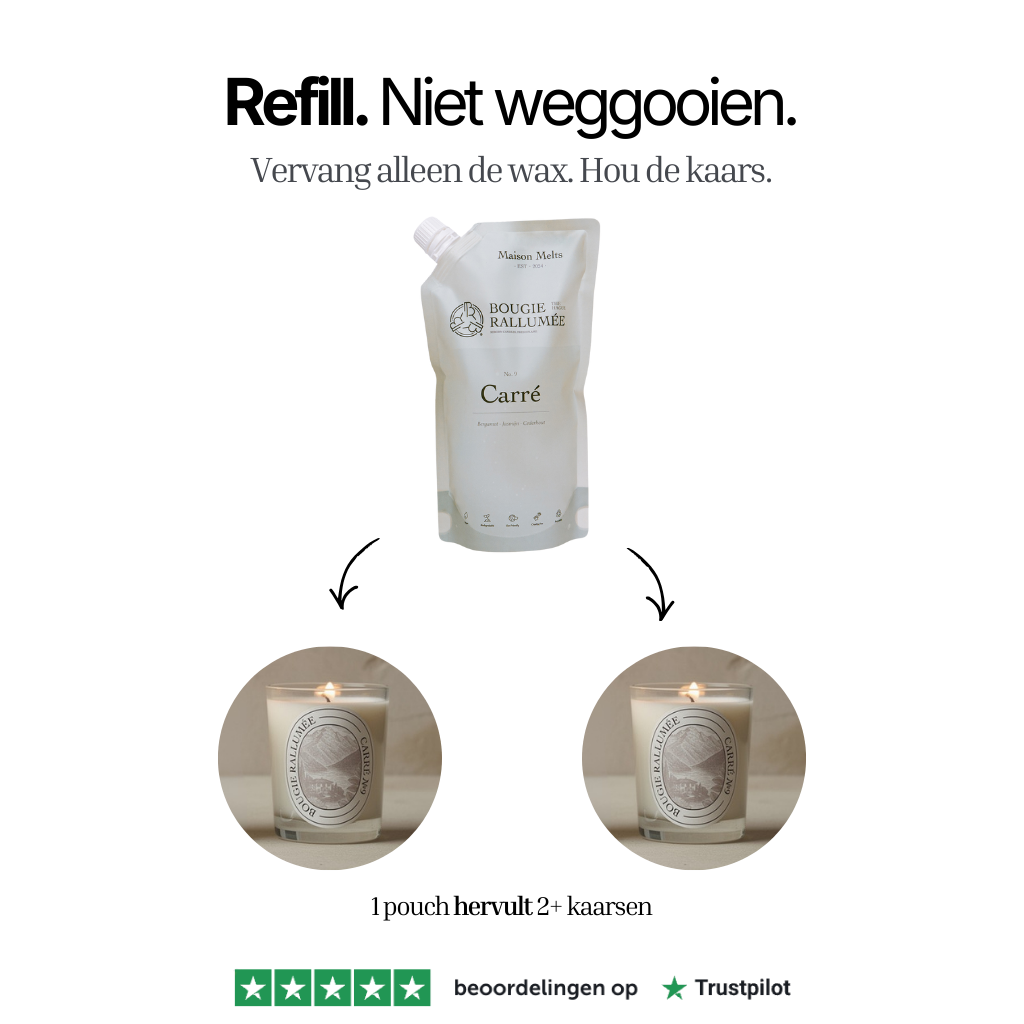 Ja. Zodra je kaars is opgebrand, kun je het glas eenvoudig opnieuw vullen met een Maison Melts refill. Eén Maison Melts pouch vult je kaars zelfs twee keer — waardoor je niet alleen je pot hergebruikt en je ecologische footprint verkleint, maar ook aanzienlijk voordeliger uit bent dan bij een nieuwe geurkaars.