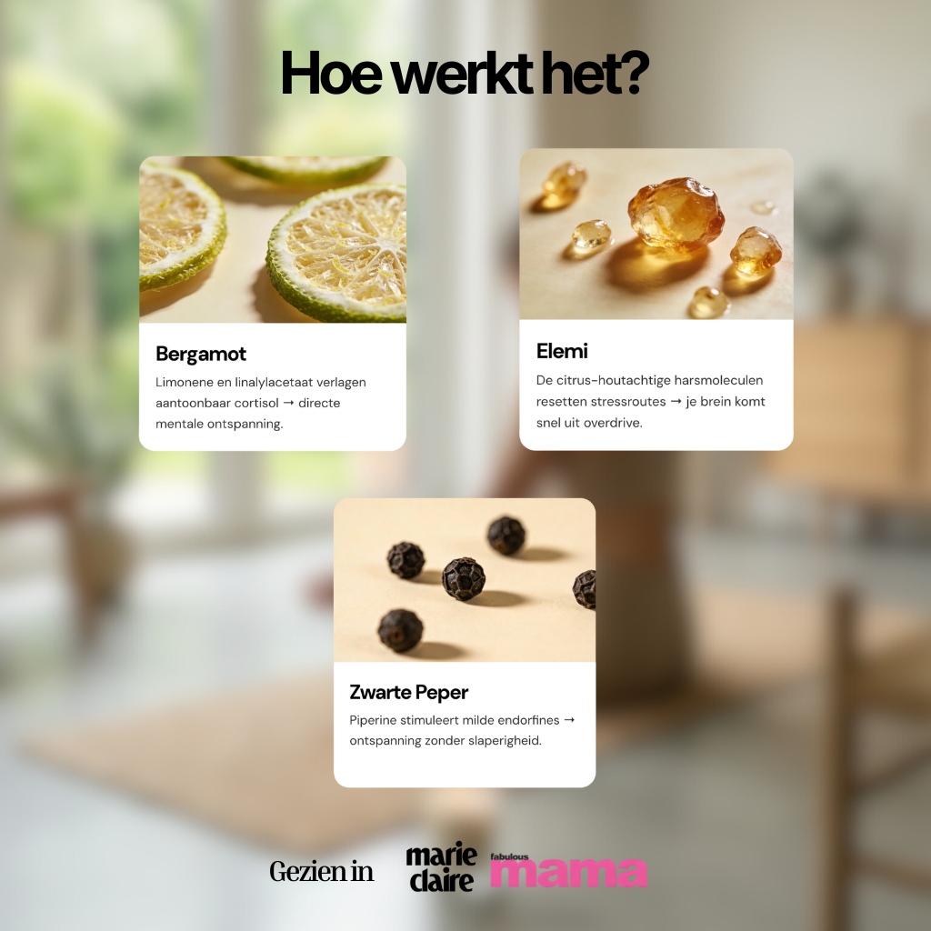 Limonene en linalylacetaat verlagen aantoonbaar cortisol → directe mentale ontspanning.