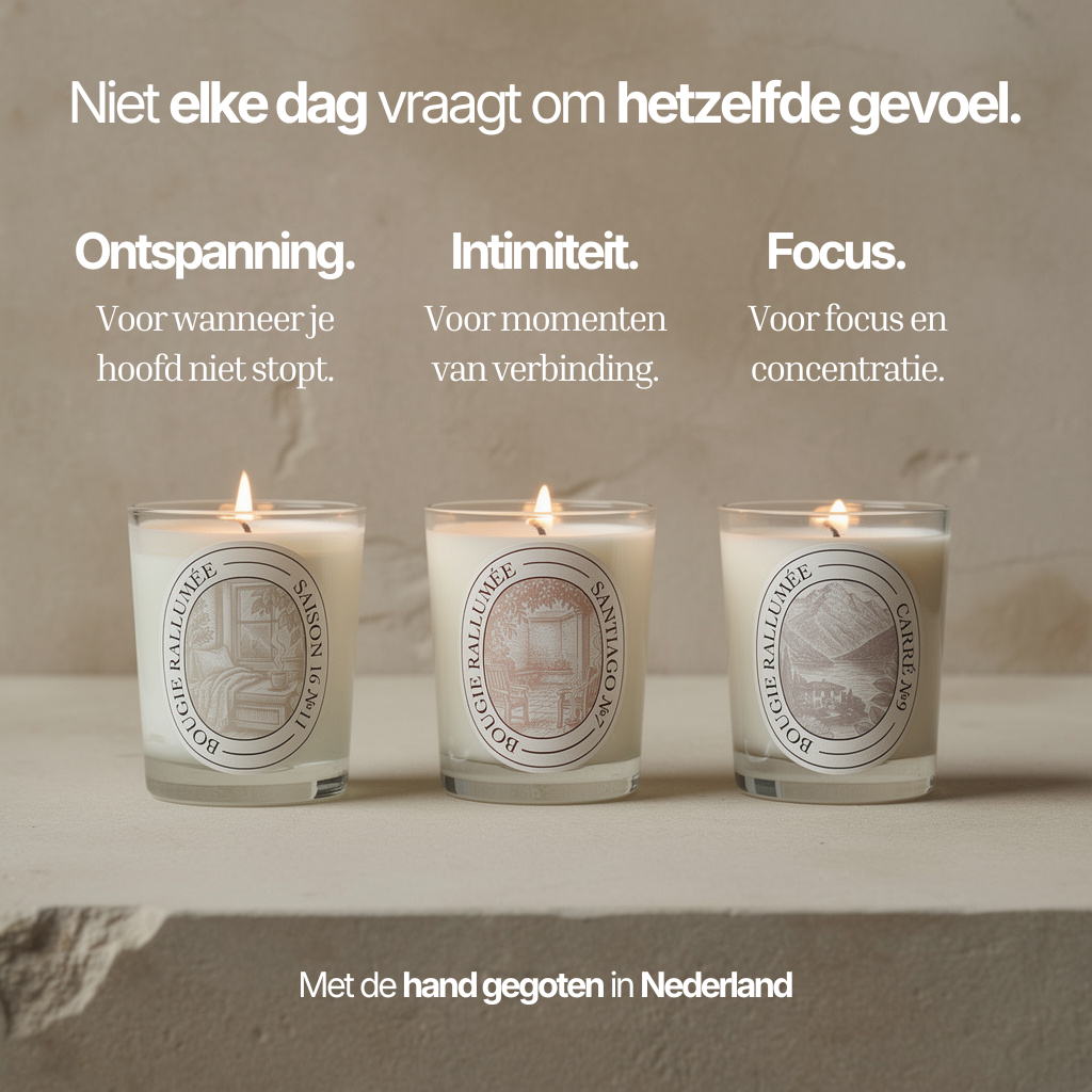 Neurowetenschappelijk ontwikkelde geurkaarsen die je stemming beïnvloeden van diepe rust tot warme intimiteit en scherpe focus.